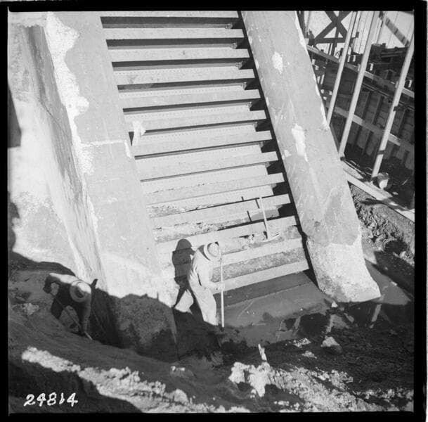 Big Creek, Florence Lake Dam - Excavating base of Arch #53 between Stoney Gate and west Sluice Gate extension, prior to backfilling.