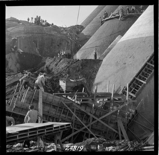 Big Creek, Florence Lake Dam - Progress photo showing first stages of backfill west side of channel. Building forms for east Sluice Gate extension and Bryant crew applying asbestile plastic on Arch No. 51.
