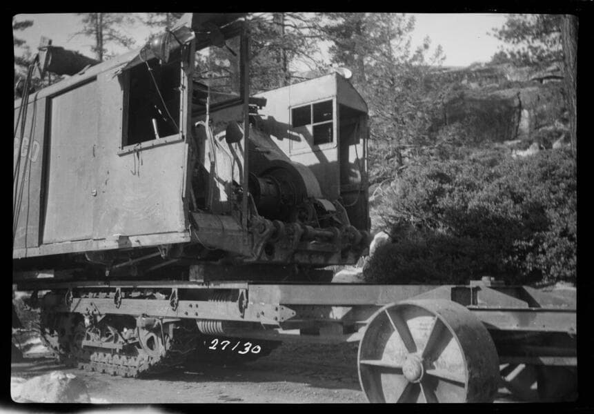 Big Creek, Florence Lake Dam - Engine and frame of Model 40 Marion shovel, mounted on trailer for transportation to Florence Tunnel after completion of excavation in Tunnel 3. Kaiser Pass to Camp 61C