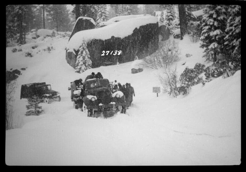 Big Creek, Florence Lake Dam - Showing damage to road between Camp 61 and Camp 62 caused by Sno-Motor.