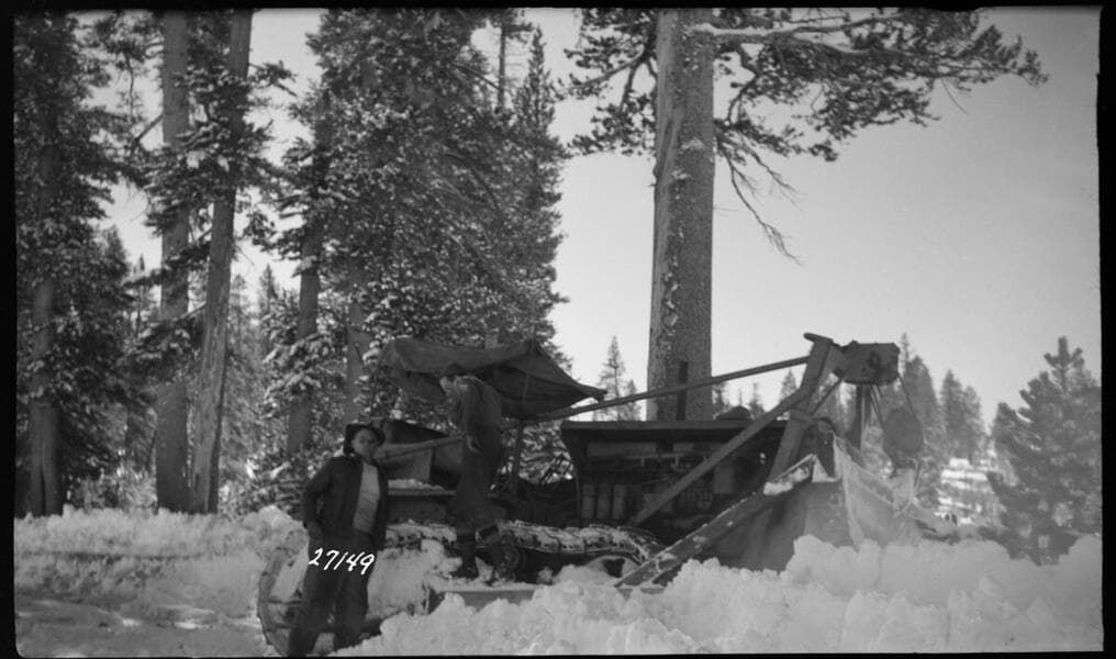 Big Creek, Florence Lake Dam - Men with shovels clearing snow from road over Kaiser Pass.