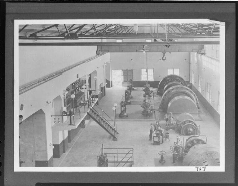 The interior of Santa Ana River #1 Hydro Plant, showing the operating crew, the switchboard, and the waterwheels.