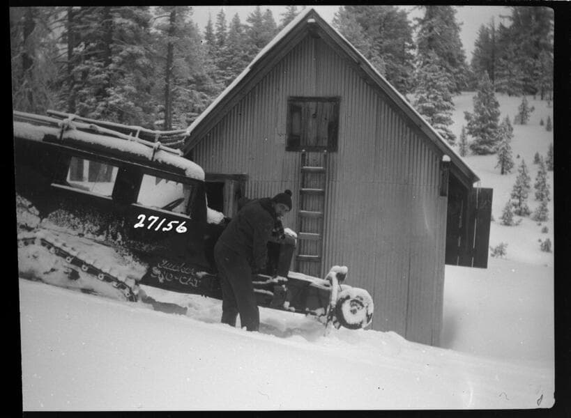 Big Creek, Florence Lake Dam - Sno-Motor at Camp 61c, Men and supplies on the first trip to Florence Lake.