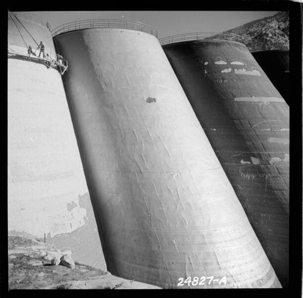 Big Creek, Florence Lake Dam - Testing for leaks on Arch 13 with saturated soap solution while steel is subjected to approximately 3/4 lb. air pressure.