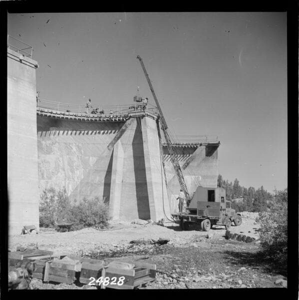 Big Creek, Florence Lake Dam - Experimental concrete walkway repair. Dumping skip of concrete near center arch.