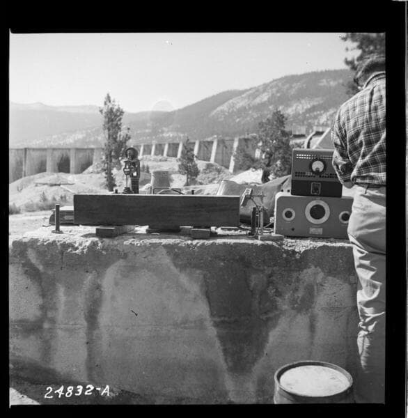 Big Creek, Florence Lake Dam - Mr. T.C. Powers applying sonic test on experimental bars stored on Angle Buttress 25.