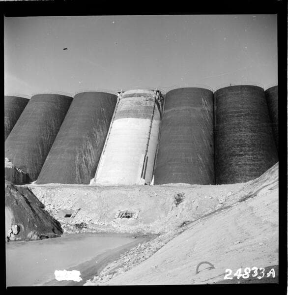 Big Creek, Florence Lake Dam - Record photo showing backfill in river section, sluice gate trash racks and newly completed fish pipe intake at close of 1943 work by construction crew.