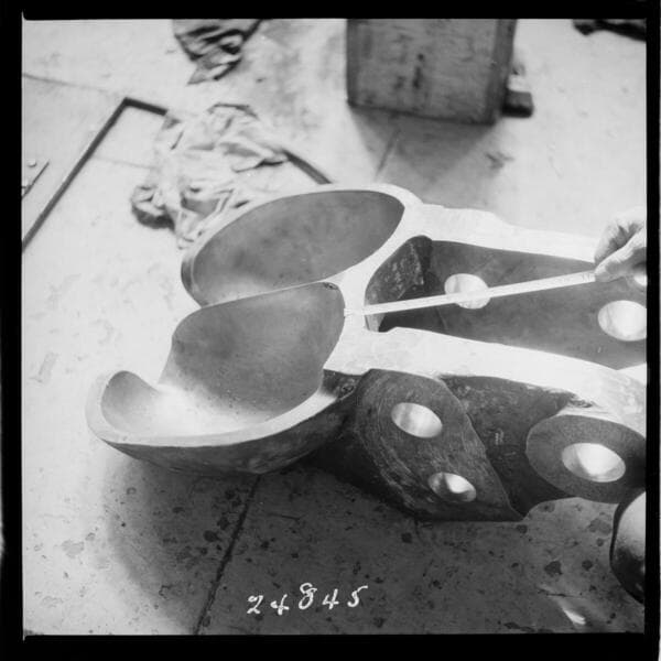 Big Creek No. 1 - Rebucketing Unit No. 2 - Close-up of bucket number 3 showing casting not finished to scribed line designated by manufacturers punch marks.