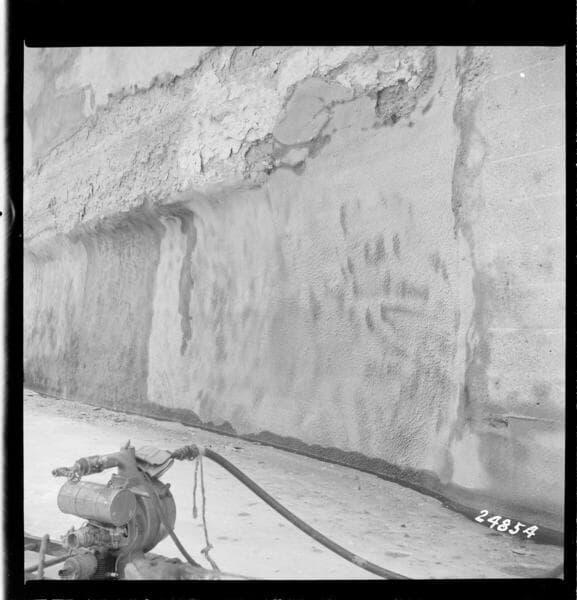Big Creek, Huntington Lake Dams - View showing cracking and back seepage from unreinforced section of gunite station 10-20 to 10-50. Elevation top cracks approximately 6902. Ice elevation 6889. Corresponds to photo No. 1 in W.L. Chadwick's Inspection Report dated 4/4/1942.