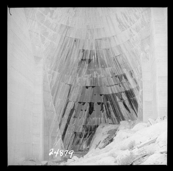 Big Creek, Florence Lake Dam - Photo of intrados of Arch 53 taken during inspection showing distribution of damp areas. Lake elevation 7326.1.