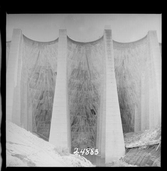 Big Creek, Florence Lake Dam - Photo of intrados of Arch 50 taken during inspection showing distribution of damp areas. Lake elevation 7326.1.