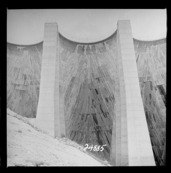 Big Creek, Florence Lake Dam - Photo of intrados of Arch 53 taken during inspection showing distribution of damp areas. Lake elevation 7326.1.