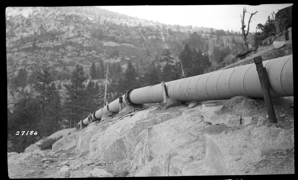 Big Creek General - Tombstone Creek pipeline showing detail cement pad on rock pier
