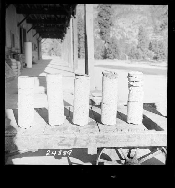 Big Creek, Florence Lake Dam - core samples taken at extrados of Arches 16, and 17 during October 1943. Reading from left to right 16-3, 16-4, 17-1, 17-2, and 17-3.