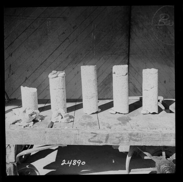 Big Creek, Florence Lake Dam - Record photo of core samples taken from extrados of Arch #9 during October 1943. Reading from left to right 9-5, 9-4, 9-3, 9-2, and 9-1.