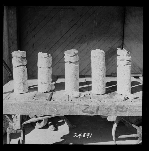 Big Creek, Florence Lake Dam - Record photo of core samples taken from extrados of Arch #9 during October 1943. Reading from left to right 9-5, 9-4, 9-3, 9-2, and 9-1.