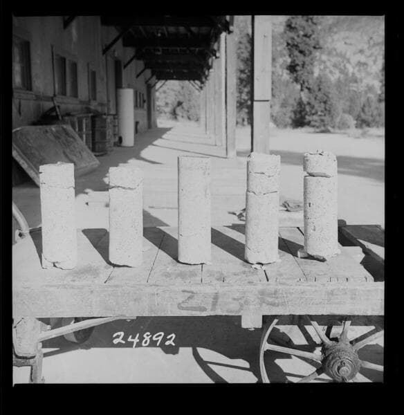 Big Creek, Florence Lake Dam - Record photo of core samples taken from extrados of Arch #9 during October 1943. Reading from left to right 9-5, 9-4, 9-3, 9-2, and 9-1.