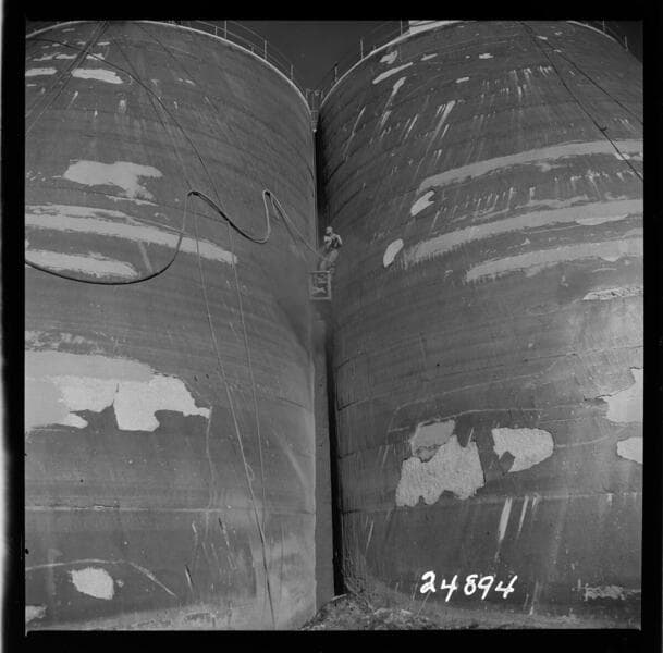 Big Creek, Florence Lake Dam - Hand tamping earth backfill in haunch between Arches 52 & 53 with Thor-Cochise spader.