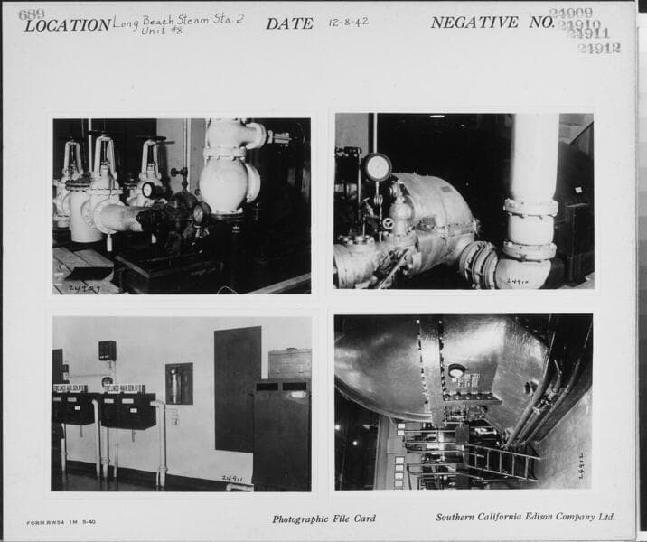 Long Beach Steam Station No. 3 turbo installation, Boiler No. 50, laying 15" gas main, driving piles for Unit No. 11, take-off towers, towers at channel crossing, installing transformers and oil switches, switching garden, [cooling water] intake, gauge board, switchboard, station overviews, turbine deck, boiler interior, defective pump, evaporators, chemistry lab, fuel oil pump room, exciter, piles ready for steel.