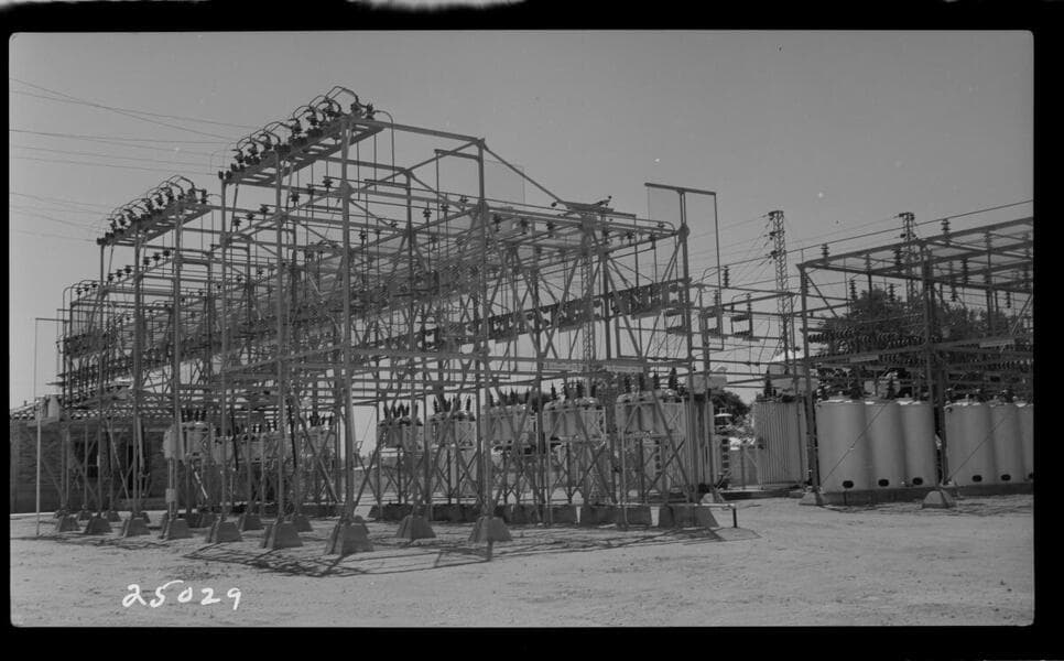 Lancaster Substation - Exterior [two men standing by Gauge Board next to transformers]