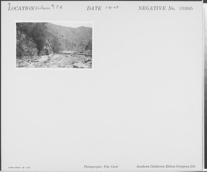 Ontario No. 2 Powerhouse - Reversal on #20654 showing damage to Ontario #2 Powerhouse after flood 1938 showing buildings in the background. A broken penstock remains with a generator and waterwheel displaced and partially buried in rubble.