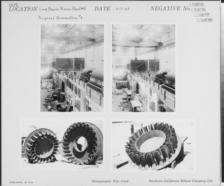 Long Beach Steam Station, Plant #2 - Unit #8 - Detail of support for balancing #8. [Plus two additional shots #25213: moving house generator, & #25214: progress dismantling #8) on same photocard].