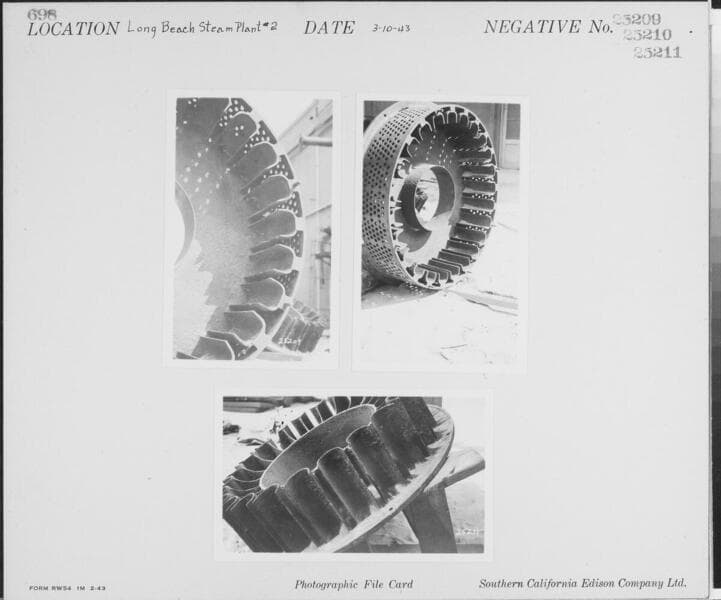 Long Beach Steam Station, Plant #2 - Unit #8 - Detail of support for balancing #8. [Plus two additional shots #25213: moving house generator, & #25214: progress dismantling #8) on same photocard].