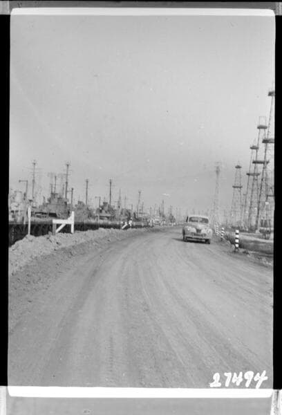 Long Beach Steam Station, Plant #3 - From north fence of Long Beach Steam Plant looking north past U. P. offset well #E-7 along road & dikes to channel towers. Elev. of road near truck is 8.2 MLLW as of 2-1-47.