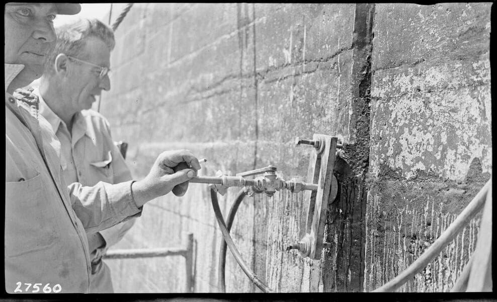 Big Creek, Shaver Lake Dam - Preparing construction joint for grouting on upstream face of Shaver Dam.