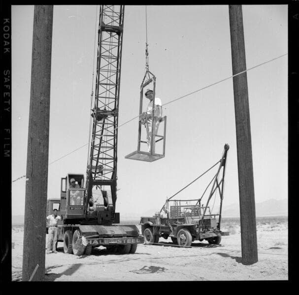 Eagle Mountain Line construction to Kaiser's Eagle Mountain Mine. -Raising insulators and conductor up to position on cross arm on wood, H-frame tower.