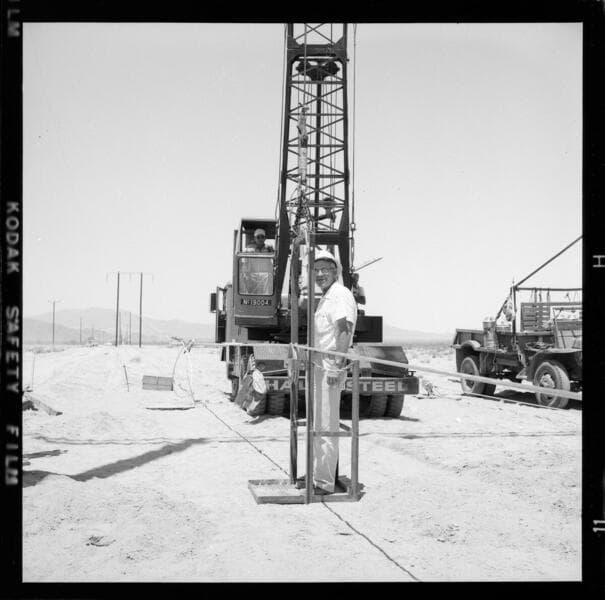 Eagle Mountain Line construction to Kaiser's Eagle Mountain Mine. -Raising insulators and conductor up to position.