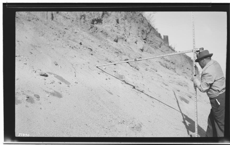 Boulder-Chino Transmission Line (3rd) - Showing excavation of soil at and between towers 1 to 2 at mile 103. Rods on centerline - 9' Rod against vertical bank is .2' in ground. 12' Rod at toe of slope. Looking north.