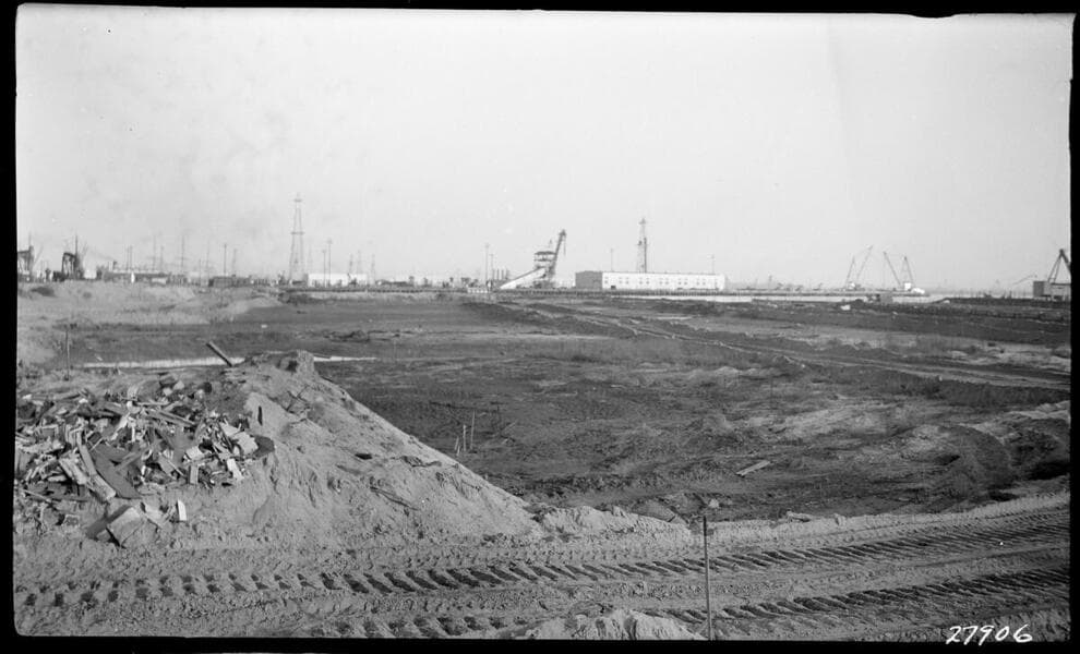 Long Beach Steam Station - Discharge Conduit - General view of excavation for discharge conduit looking west from Station 9+50 at beginning of pile driving operations.