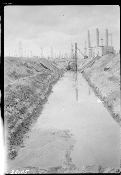 Long Beach Steam Station - Discharge Conduit - Pile driver in cut after flooding.