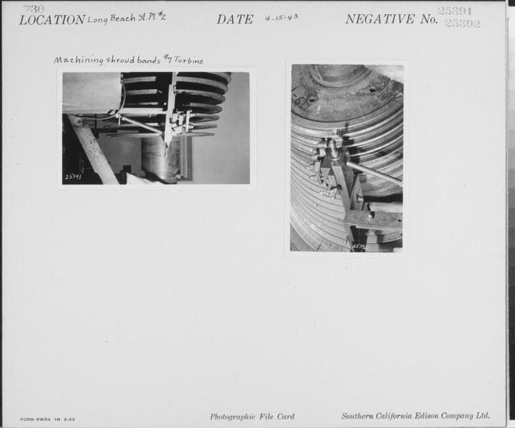 Long Beach Steam Station, Plant #2 - Machining shroud bands #7 turbo.[Plus two additional shots (#25389: Progress constructing 8-R condenser, & #25390: typical circumference weld on 8-R condenser) on same photocard].
