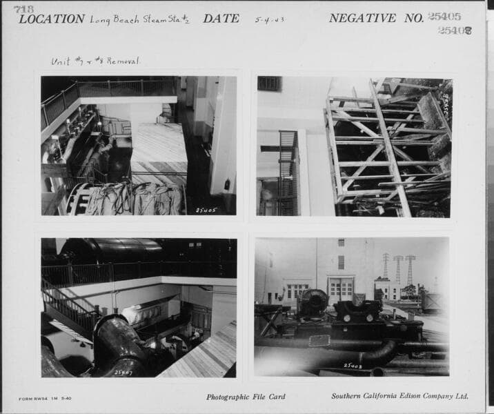 Long Beach Steam Station, Plant #2 - Units 7 & 8 removal - storage yard [Plus three additional shots of 7 & 8 removal - #25402, #25403: Storage area northwest of Unit 10, Plant 3, & #25404: Storage and repair area) on same photocard].