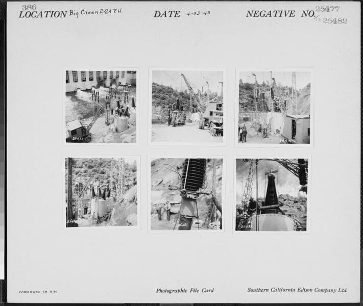 Big Creek - Powerhouse #2 & 2a (part 2) [Powerhouse 2 & 2A - auto transformers, substation, new 6.6kV line, new bridge for powerhouse extension, Unit #4 with direct connected exciter, constructing new Unit #4, 150kV - 220kV Bushings, switchboard, installation of new Unit #4 penstock, concrete plant, incline batch cars, stand pipes, Unit #3 foundation, Unit #3 penstock install, valve house modification, rock crushing plant, Johnson Valve, assembly of new Unit #3, auto circuit breakers, 150kV Oil Switch, new hoist, auto-transformers, and 11kV equipment, new Bus Bar installation, Governor #4; Camp #7 - telephone exchange, cottage, machine shop, warehouse, mess hall construction, sawmill; Camp #5 - forebay construction, batch plant, steam shovel excavating.]
