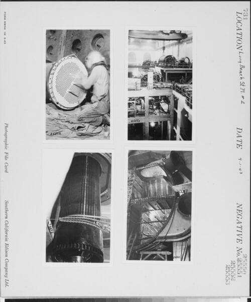 Long Beach Steam Station, Plant #2 - Unit 8-R - Unloading condenser shell [Plus three additional shots (#25377: Unloading first sections of 8R condenser shell, & #25378 & #25379 (safety negs): moving house generator) on same photocard].