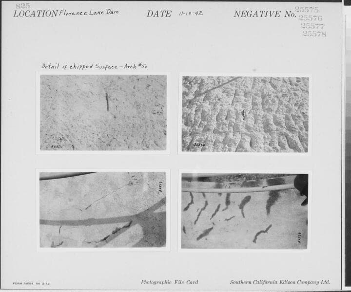 Big Creek, Florence Lake Dam - Close-up of gunite key at base of Arch #13, showing evidence of back leakage. Gunite key was covered with asbestile on November 25, 1942.