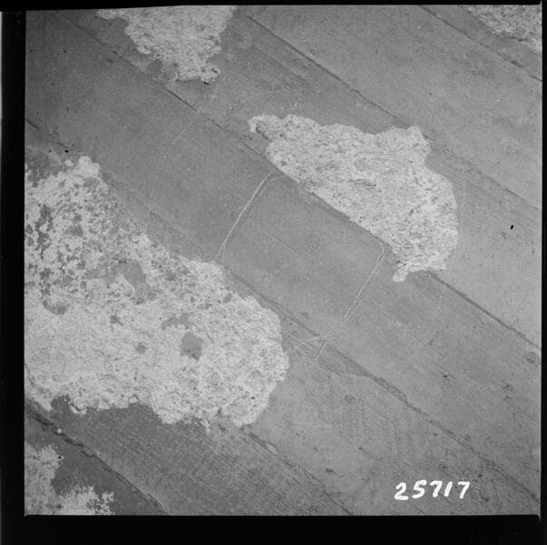 Big Creek, Florence Lake Dam - Close-up of open seam at junction of angle buttress 10 and Arch 11 at elevation 7288. 1 1/8" barrel reinforcing steel exposed by chipping and cleaning out seam. This seam is directly opposite spurt noted on downstream side during inspection.