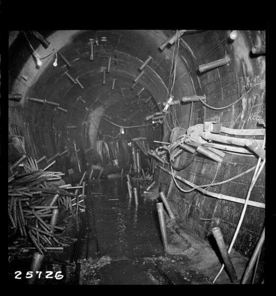 Big Creek, Huntington-Pitman-Shaver Diversion - Huntington Shaver Tunnel, Adit 1, Camp 72 - repairs - placement of reinforcement steel in tunnel.