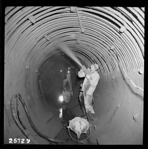 Big Creek, Huntington-Pitman-Shaver Diversion - Huntington Shaver Tunnel, Adit 1, Camp 72 - repairs - start of guniting.