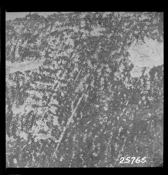 Big Creek, Florence Lake Dam - Close-up of original surface of arch underneath gunite near crown of Arch #20. Original surface chipped free of Intertol. Concrete perfectly sound and dry. .