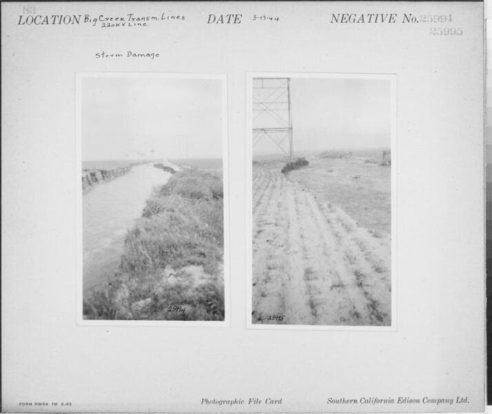 Big Creek Transmission Line - 220kV - Puente-Chino 66kV line storm damage. [plus similar shot (#25903) on same photocard].