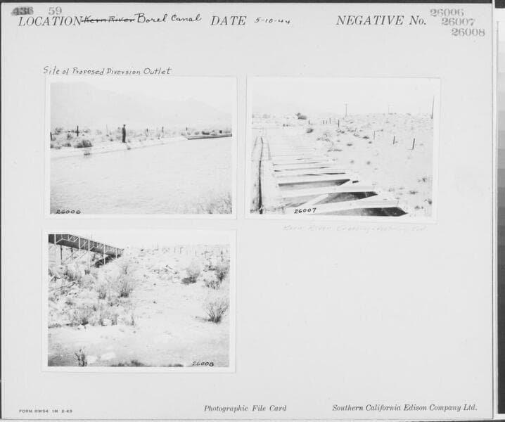 Borel Powerhouse - Borel Canal - Erskine Creek - Country Road Bridge - looking upstream. [plus additional shot: Borel Canal - Mills Case, Station N.P.5+37.43. pool of surface water 25 ft. N. (#29610) - on same photocard]