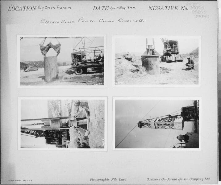 Big Creek Transmission Line - [Tower construction] Castaic Creek - Pacific Crane & Rigging Co. [plus similar shots (#26082, #26083, & #26084) on same photocard].