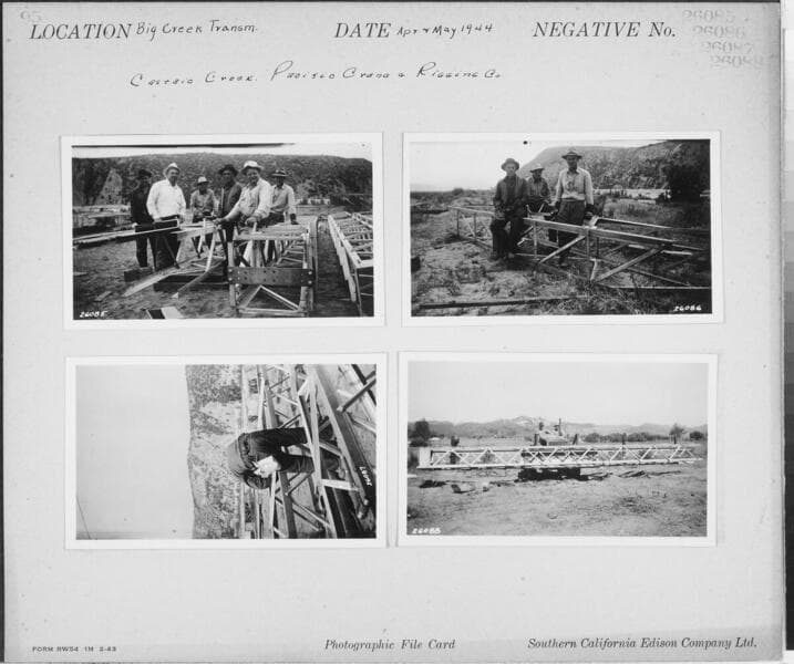 Big Creek Transmission Line - [Tower construction] Castaic Creek - Pacific Crane & Rigging Co. [plus similar shots (#26090, #26091, & #26092) on same photocard].