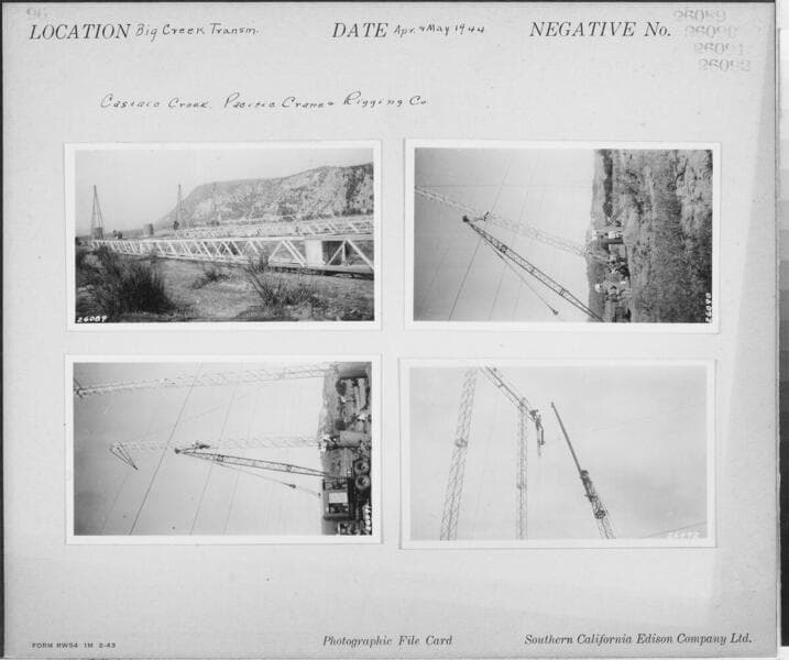 Big Creek Transmission Line - [Tower construction] Castaic Creek - Pacific Crane & Rigging Co. [plus similar shots (#26082, #26083, & #26084) on same photocard].
