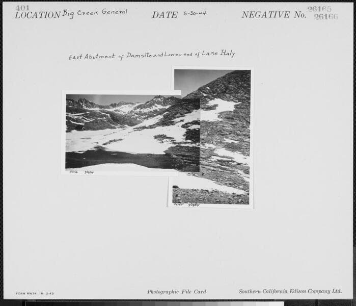 Bear Creek High Lakes - East Abutment of Dam Site and Lower end of Lake Italy.