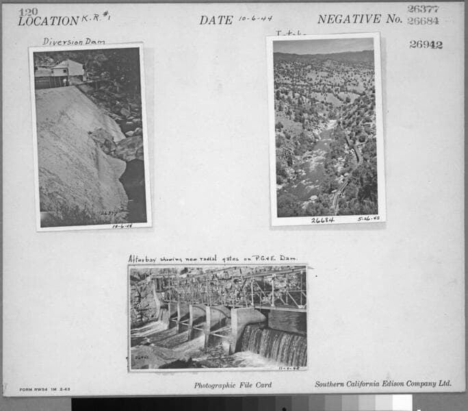 Kern River No. 1 - River below Democrat Dam. [Upstream view of the headworks and dam for Kern River #1.